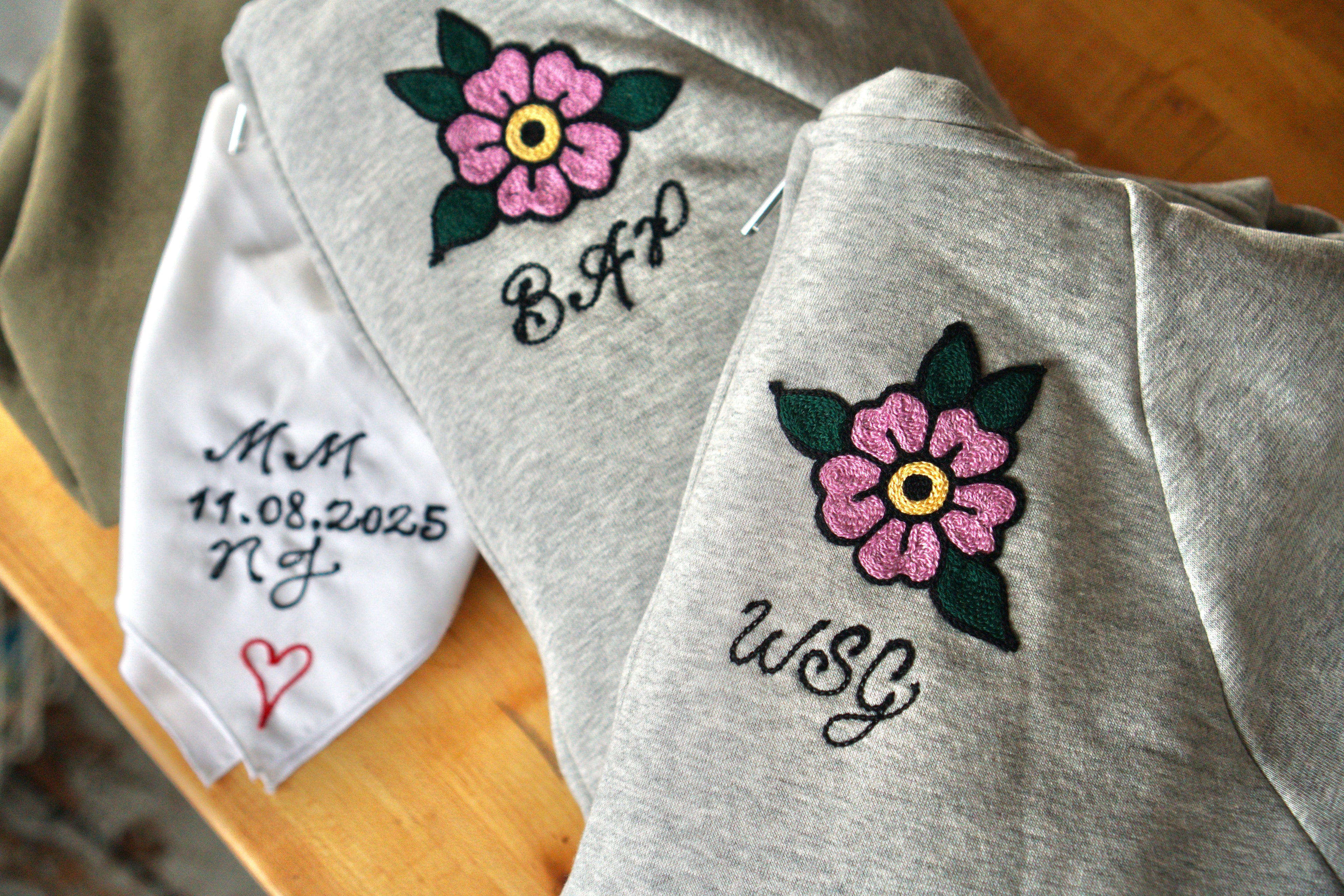 We carry a selection of high quality blanks in the shop, or you can bring in your own to get embroidered.