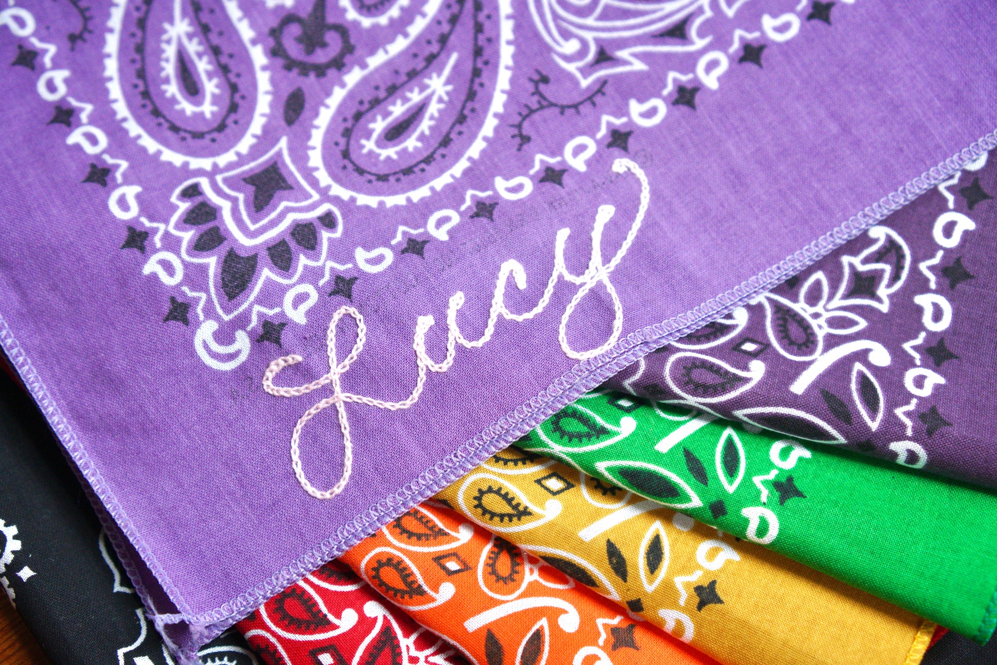Great for humans and doggies alike, our made in the USA bandanas include a chainstitched word or phrase (up to two words) in your choice of thread color.